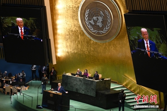 當(dāng)?shù)貢r間9月23日,紐約聯(lián)合國總部,第80屆聯(lián)合國大會一般性辯論開幕。圖為美國總統(tǒng)特朗普發(fā)言。中新社記者 陳孟統(tǒng) 攝