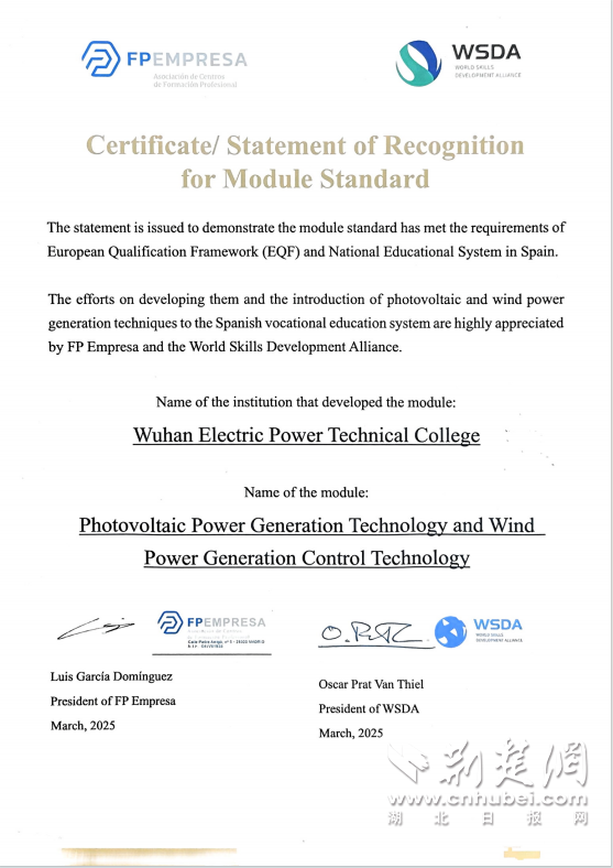荊楚網(wǎng)(湖北日?qǐng)?bào)網(wǎng))訊(通訊員 陳書(shū)雨)當(dāng)前全球能源結(jié)構(gòu)加速向可再生能源轉(zhuǎn)型,跨國(guó)技術(shù)協(xié)作與職業(yè)教育標(biāo)準(zhǔn)互通,已成為推動(dòng)能源產(chǎn)業(yè)高質(zhì)量發(fā)展的關(guān)鍵紐帶。9月26日,國(guó)網(wǎng)湖北技培中心(武漢電院)(以下簡(jiǎn)稱“技培(電院)”)“西班牙國(guó)家課程標(biāo)準(zhǔn)及數(shù)字化課程開(kāi)發(fā)項(xiàng)目”關(guān)鍵節(jié)點(diǎn)落地,成功完成《光伏發(fā)電技術(shù)》《風(fēng)力發(fā)電控制技術(shù)》兩門課程跨國(guó)培訓(xùn)直播,這一里程碑事件標(biāo)志著技培(電院)自主研發(fā)的兩門課程標(biāo)準(zhǔn)正式輸出西班牙,為中西能源職教合作搭建起全新橋梁。