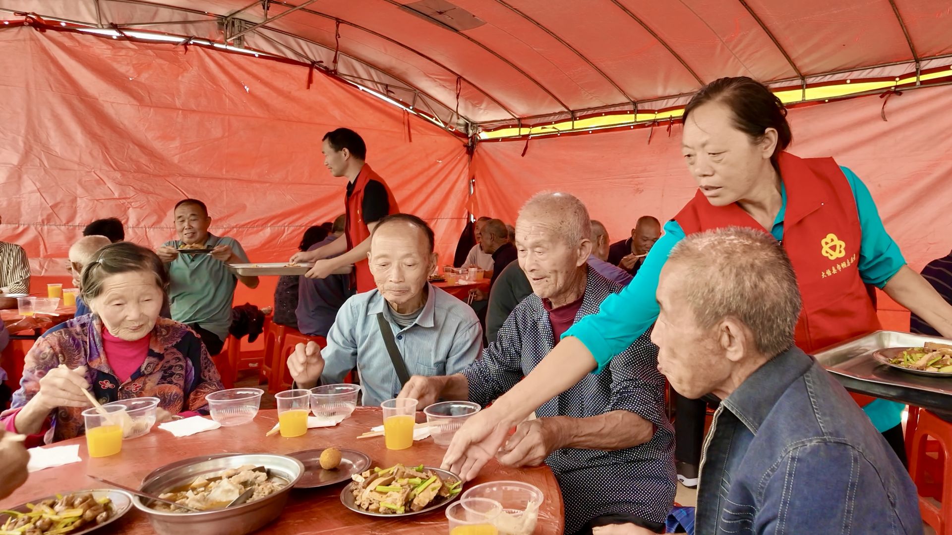 與此同時(shí),在村黨支部的組織動(dòng)員下,志愿者們?cè)缫衙β甸_來。洗菜、切菜、烹制......大家分工協(xié)作,精心準(zhǔn)備豐盛的團(tuán)圓宴。灶臺(tái)上熱氣騰騰,空氣中彌漫著誘人香氣。北河村黨支部書記顏業(yè)青介紹:“我們提前三天就開始準(zhǔn)備農(nóng)家菜,特意做了老人們愛吃的燒麥等特色美食,希望讓他們感受到節(jié)日的溫暖。”