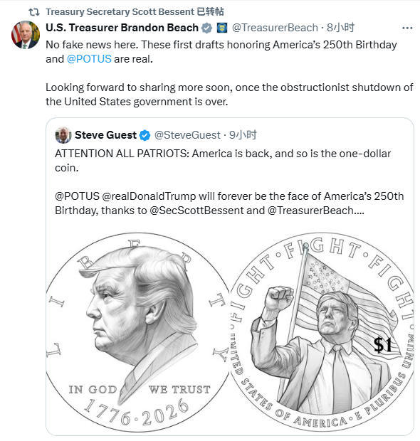 美國(guó)財(cái)政部官員布蘭登·比奇在社交媒體上回應(yīng)了這一消息,并稱“這不是假新聞。這些紀(jì)念美國(guó)建國(guó)250周年的首批初稿是真的?!北绕孢€寫道,一旦美國(guó)政府“關(guān)門”事件結(jié)束,他期待能盡快分享更多相關(guān)信息。
