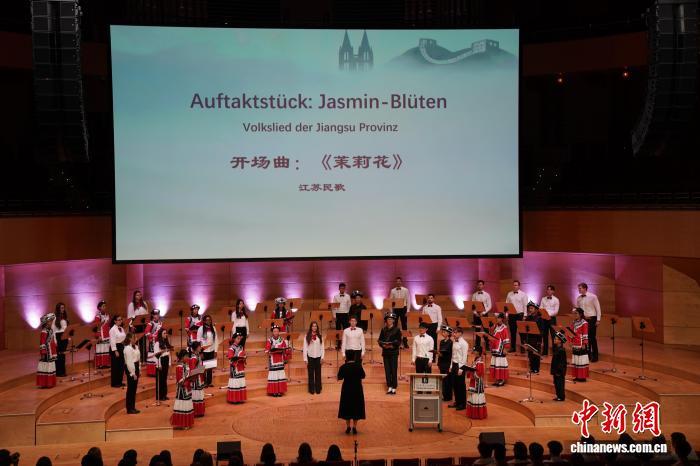 當(dāng)?shù)貢r(shí)間10月4日,中德青少年交流音樂會(huì)暨“唱歌學(xué)中文”夏令營(yíng)匯報(bào)演出在德國(guó)埃森舉行。圖為中德青少年合唱開場(chǎng)曲《茉莉花》。 中新社記者 馬秀秀 攝