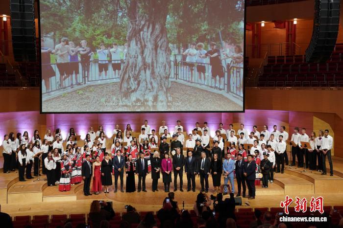 當(dāng)?shù)貢r(shí)間10月4日,中德青少年交流音樂會(huì)暨“唱歌學(xué)中文”夏令營(yíng)匯報(bào)演出在德國(guó)埃森舉行。圖為嘉賓與中德青少年等合影?!≈行律缬浾?馬秀秀 攝
