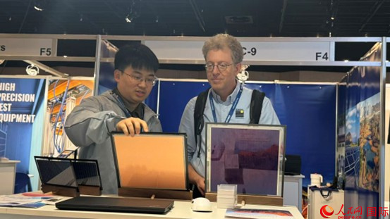 中國(guó)企業(yè)鶉火光電工作人員向歐美客戶展示該企業(yè)研發(fā)制造的鈣鈦礦電池。人民網(wǎng)記者 顏歡攝