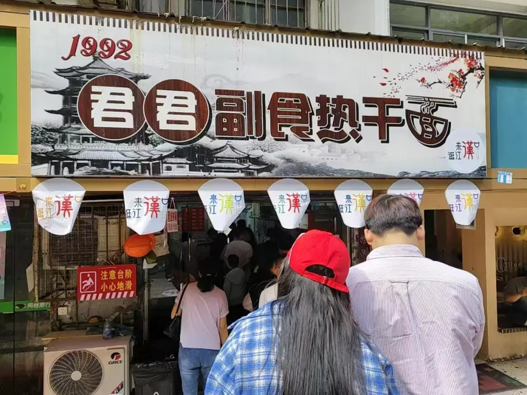 優(yōu)化營商環(huán)境,關鍵要讓小店輕裝上陣。作為江漢區(qū)碳水文化的重要符號,君君副食曾受限于門面窄小,客流量大時顧客只能站著吃、蹲著拌,體驗不佳等各類問題。街道了解情況后主動靠前,聯(lián)動相關部門爭取支持,既保留了老店小而美的煙火氣,又通過合理規(guī)劃提升了經(jīng)營舒適度。如今,游客順著“漢口必吃榜”“來漢口 逛江漢”的推薦牌來打卡,周邊上班的白領順路打包,小店日均客流更穩(wěn)定,口碑也越傳越遠。