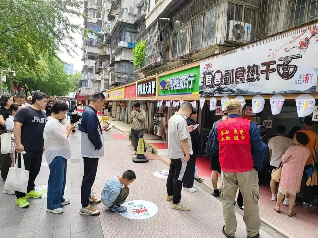 國慶中秋假期,江漢區(qū)游客量激增,君君副食的隊伍從店門口蜿蜒著排出數(shù)十米。社區(qū)志愿者舉著醒目的提示牌引導停車,網(wǎng)格員把路邊的共享單車統(tǒng)一移走,引導著慕名而來的食客井然有序地排隊等候?!耙郧耙坏焦?jié)假日就發(fā)愁,客人擠得轉不開身,現(xiàn)在有專人維持秩序,生意反而更穩(wěn)當了?!钡曛饔喟⒁滩林~頭的汗笑言。