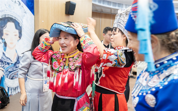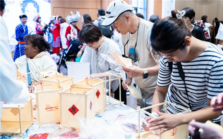 在互動體驗區(qū),參觀者們興致盎然地參與刺繡杯墊制作,在工藝師的指導(dǎo)下,親手繡制月亮、玉兔等圖案,體會一針一線中的匠心之美。在“月兔搗藥”香包與“中秋攬月”宮燈制作區(qū),嘉賓們在動手創(chuàng)造的過程中,深入感受了中國傳統(tǒng)手工藝的趣味與智慧。民族服飾體驗區(qū)尤為熱鬧,各國來賓紛紛換上苗族銀飾盛裝、藏族藏袍等民族服飾,拍照合影,留下難忘瞬間。