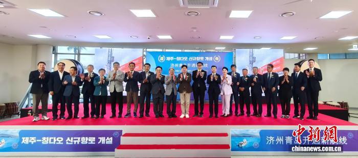 10月18日,“濟(jì)州—青島新航線開通”慶?;顒釉陧n國濟(jì)州舉行。圖為活動現(xiàn)場合影。中國駐濟(jì)州總領(lǐng)事館 供圖