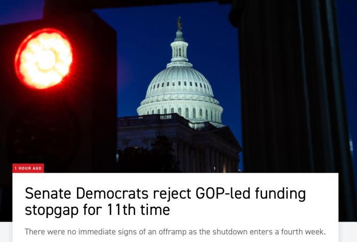 該法案原計劃將政府資金延長至11月21日,最終以50票贊成、43票反對未達通過所需的60票門檻。