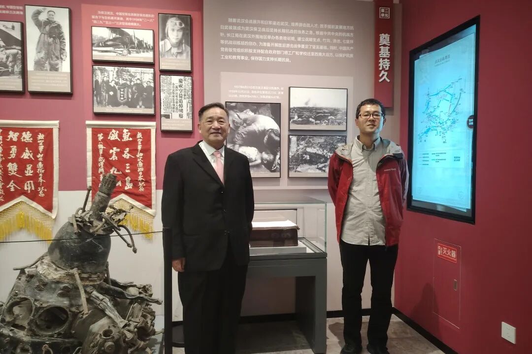 在周靜館長帶領(lǐng)下,小林拓也、中國空軍勇士陳懷民烈士侄子陳德、民間收藏家代表周啟壯、武漢人文歷史愛好者袁厚翔等一行,首先參觀了基本陳列《英雄城市 抗戰(zhàn)烽火——武漢抗戰(zhàn)歷史特展》,詳細(xì)了解了全民族抗戰(zhàn)爆發(fā)后,武漢逐步成為當(dāng)時全國抗戰(zhàn)中心和武漢保衛(wèi)戰(zhàn)的相關(guān)史實,以及為鞏固、發(fā)展抗日民族統(tǒng)一戰(zhàn)線,周恩來、博古、董必武、葉劍英等中國共產(chǎn)黨人在武漢所做的各種努力。