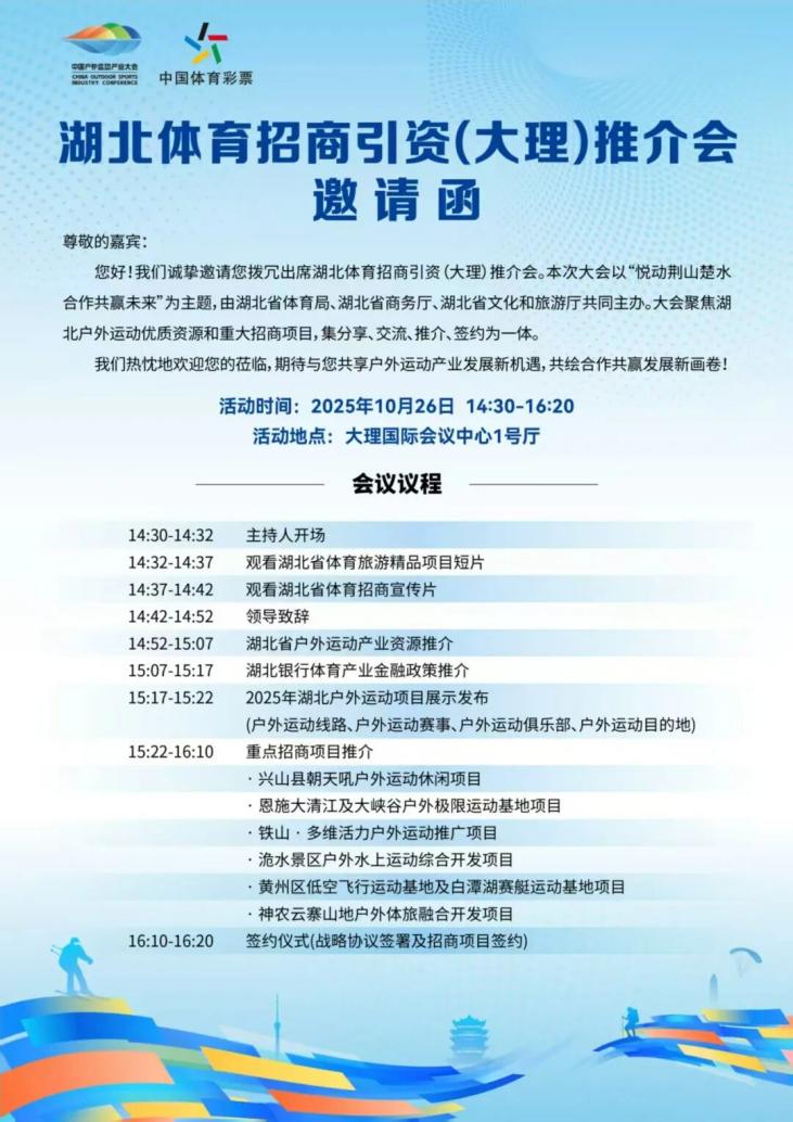 為貫徹體育產(chǎn)業(yè)高質(zhì)量發(fā)展部署,釋放湖北戶外運(yùn)動資源優(yōu)勢,搭建跨區(qū)域合作平臺,由湖北省體育局、湖北省商務(wù)廳、湖北省文化和旅游廳聯(lián)合主辦的2025中國戶外運(yùn)動產(chǎn)業(yè)大會湖北專場推介活動,將于10月26日14:30-16:20在云南大理國際會議中心1號廳重磅舉行。