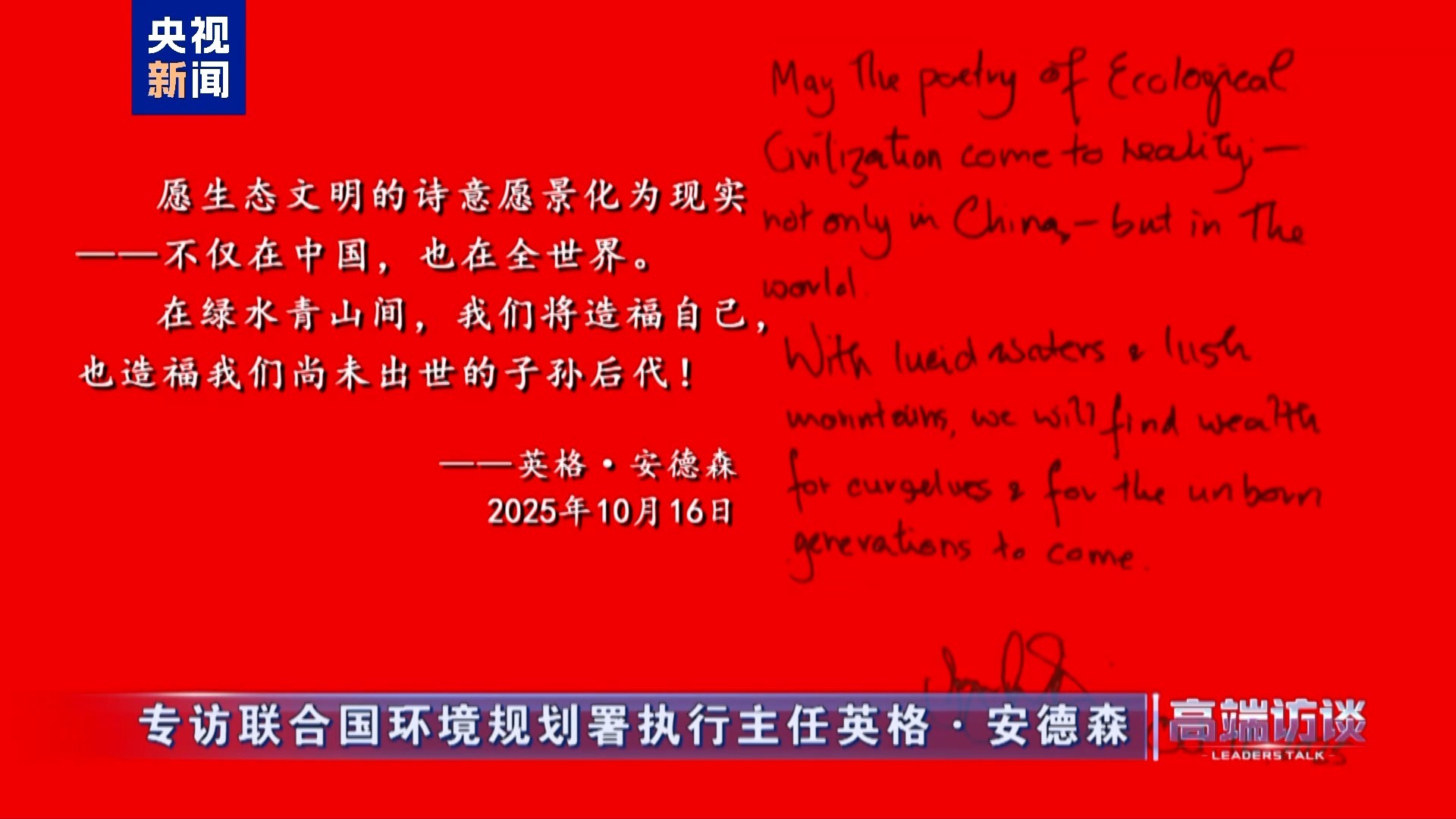 聯(lián)合國環(huán)境規(guī)劃署執(zhí)行主任英格·安德森在接受總臺專訪后題詞: