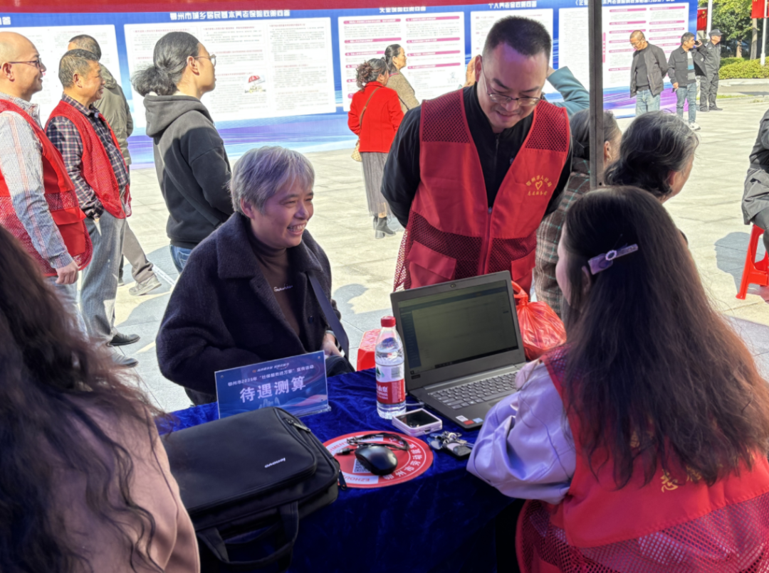 鄂州市“社保服務(wù)進(jìn)萬家”主場活動現(xiàn)場,工作人員為即將退休的群眾測算社保待遇。