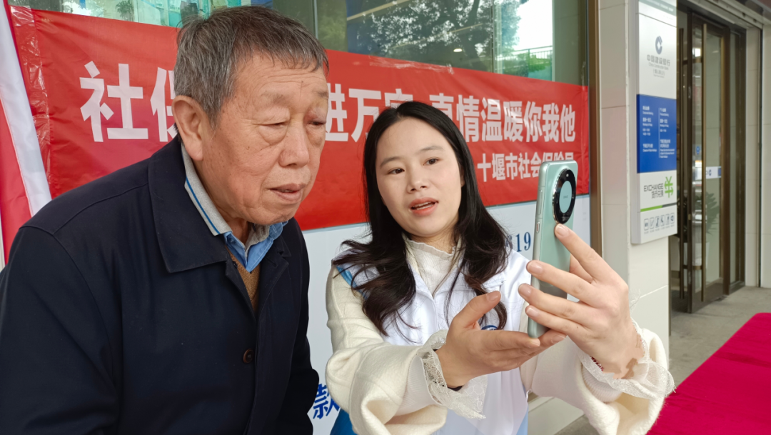 十堰市五堰建行“社銀合作”網(wǎng)點,工作人員向群眾演示社保業(yè)務(wù)“掌上辦”。