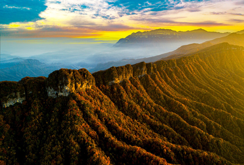 光明璀璨,霧象萬千。光霧山,地處中國南北氣候分界線,獨(dú)特的地理位置和復(fù)雜多變的山地氣候,孕育了極其豐富的植物群落。每當(dāng)深秋時(shí)節(jié),寒意浸染,以巴山水青岡、槭樹、黃櫨等為主的680平方公里彩林,便奏起了生命的華彩樂章。色彩從山頂向山谷層層浸染,緋紅、橙紅、霞紅、金紅、絳紫……各種紅色交織疊加,如巨幅油畫,似流霞滿天,其面積之廣闊、色彩之斑斕、層次之分明、觀賞期之綿長,構(gòu)成了“亞洲最長紅地毯”的驚世之美,堪稱自然造物的奇跡。