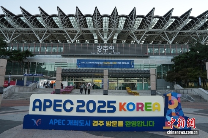 當(dāng)?shù)貢r間10月27日,韓國慶州火車站前的亞太經(jīng)合組織(APEC)標(biāo)識。中新社記者 劉旭 攝