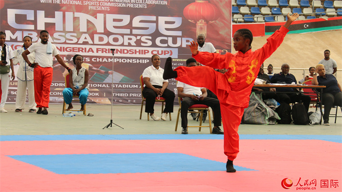 決賽活動現(xiàn)場,來自尼日利亞各地的武術愛好者圍繞太極、套路、男子散打、女子散打、創(chuàng)意表演、團體比賽等六個比賽項目展開激烈角逐。場上,選手們一招一式,有板有眼,充分展示了中國武術文化蘊含的堅韌、拼搏精神,贏得了觀眾陣陣掌聲與歡呼聲。