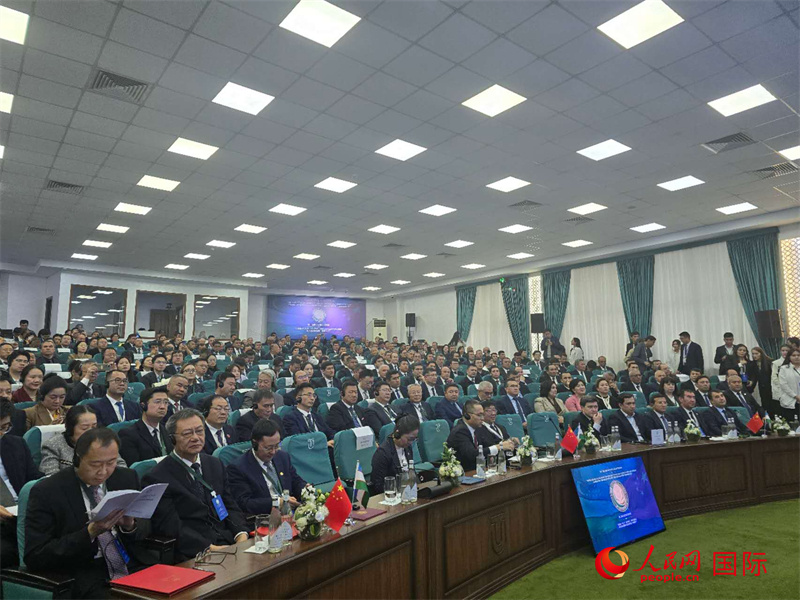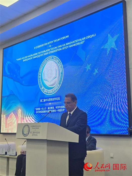 烏茲別克斯坦高等教育、科學與創(chuàng)新部部長孔格拉特拜·沙里波夫致辭。人民網(wǎng)記者 李強攝