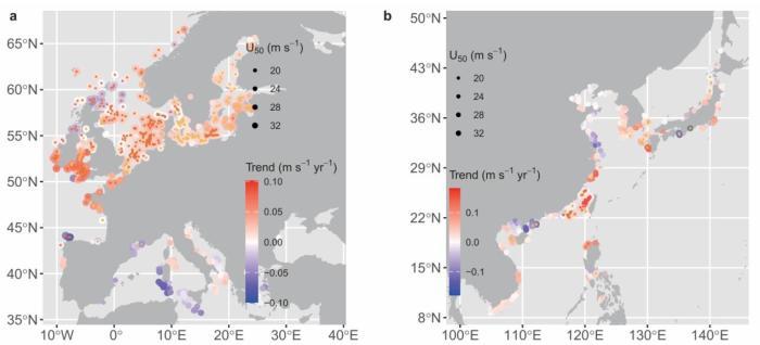 在本項研究中,論文共同通訊作者、南方科技大學教授曾振中和同事及合作者一起,分析了全球海洋1940年至2023年的每小時風速數(shù)據(jù)。他們發(fā)現(xiàn),全球超過60%的沿海區(qū)域呈現(xiàn)極端風速顯著上升的趨勢,并常與全球變暖下的天氣系統(tǒng)變化相關(guān)。
