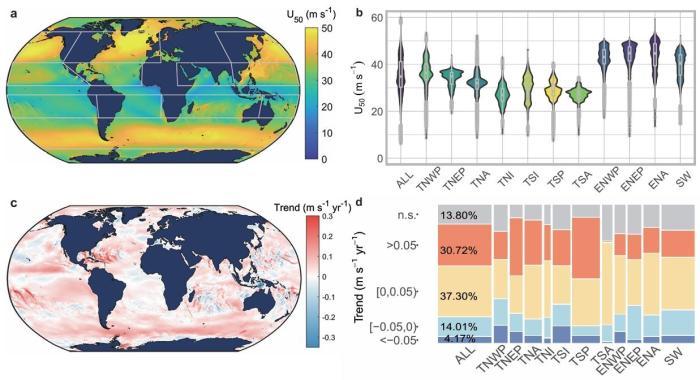 全球極端風速(50年重現(xiàn)期風速)空間分布及其變化趨勢。研究團隊 供圖