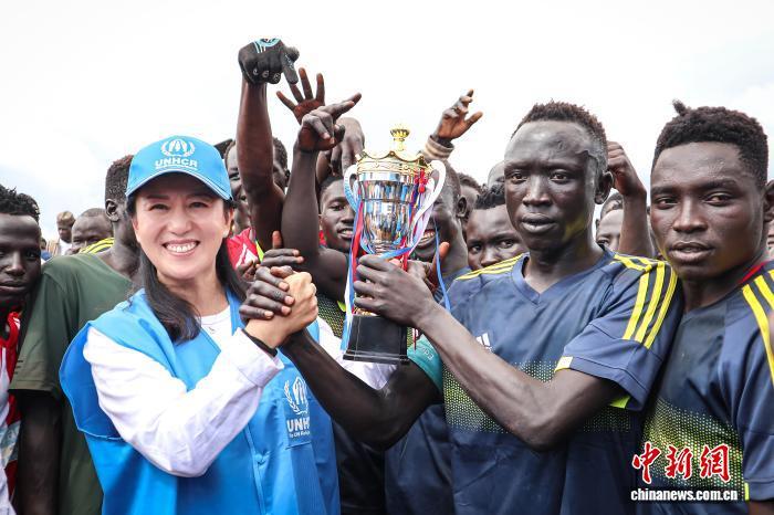 當(dāng)?shù)貢r(shí)間2025年9月23日,聯(lián)合國(guó)難民署親善大使楊揚(yáng)訪問(wèn)位于埃塞俄比亞的班巴西難民營(yíng),與難民及當(dāng)?shù)厣鐓^(qū)足球友誼賽獲勝團(tuán)隊(duì)共同舉起獎(jiǎng)杯。(聯(lián)合國(guó)難民署供圖)