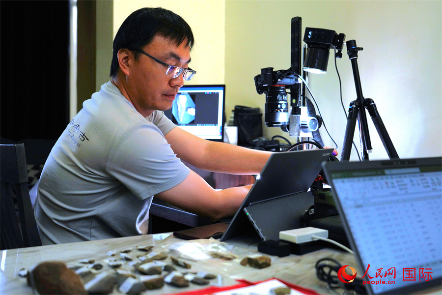 中方隊(duì)員顧雪軍對第10地點(diǎn)出土石制品進(jìn)行分類整理。人民網(wǎng)記者 黃煒鑫攝