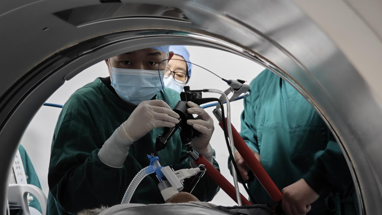 針對兩名患者的復雜病情,醫(yī)院啟動MDT多學科聯(lián)合診療機制。放射影像科、核醫(yī)學科、疼痛科、胸外科、腫瘤科等多學科專家共同研討,呼吸與危重癥醫(yī)學科劉鈞副主任醫(yī)師、邱琦主治醫(yī)師等反復評估患者病情,經(jīng)與家屬充分溝通后,最終決定采用AI+AR光學導航支氣管鏡聯(lián)合徑向超聲引導下的冷凍消融術,在精準作用于病灶的同時,最大程度保護患者肺功能。