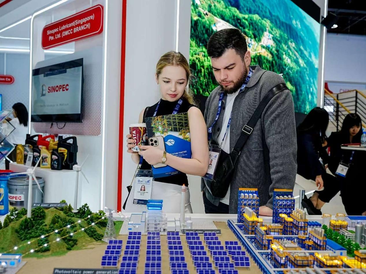 第41屆阿布扎比國(guó)際石油展期間,與會(huì)人士在參觀中國(guó)石化展出的綠電制氫項(xiàng)目沙盤(pán)。主辦方供圖