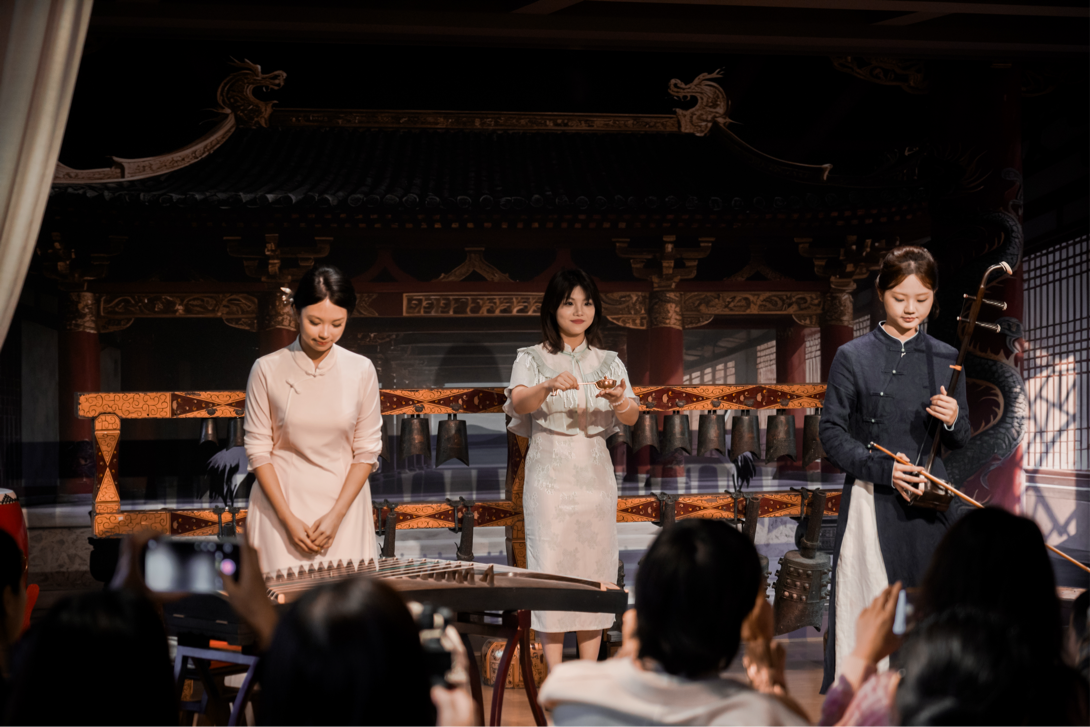 在荊州博物館的場域里,湖北第二師范學(xué)院美育團(tuán)隊(duì)帶來的“文人雅韻”篇章,更落地了“人人美育,美育人人,美育浸潤,培根鑄魂”的理念:一方面,書法的枯潤濃淡與樂器技法呼應(yīng)——《寒食帖》里二胡長音摹寫“破灶”筆觸,《松風(fēng)閣》中琵琶輪拂復(fù)刻松濤筆勢(shì);另一方面,荊州博物館助力還原的宋代“嬰香”(依《陳氏香譜》復(fù)原)、編鐘紋飾拓片、三帖高仿復(fù)本,讓觀眾在“視聽嗅觸”中觸摸文物與書法的溫度,文物不再是玻璃后的靜物,而是美育的鮮活教材,更是文博資源與美育理念的共生,在文博與藝術(shù)的碰撞里讓荊楚文化的“根”,扎得更深。