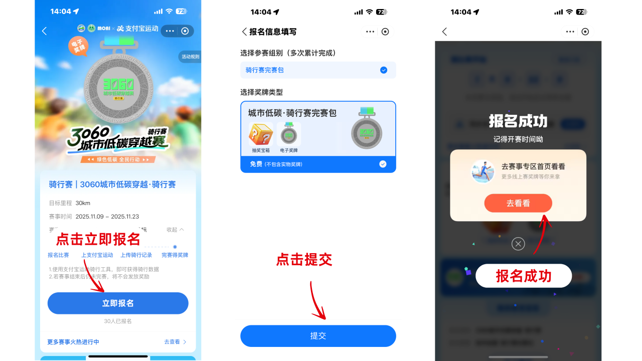 通過支付寶APP,搜索“支付寶運動”小程序進入“線上賽”專區(qū)報名參賽,或搜索“3060城市低碳穿越賽”小程序輪播頁跳轉報名。