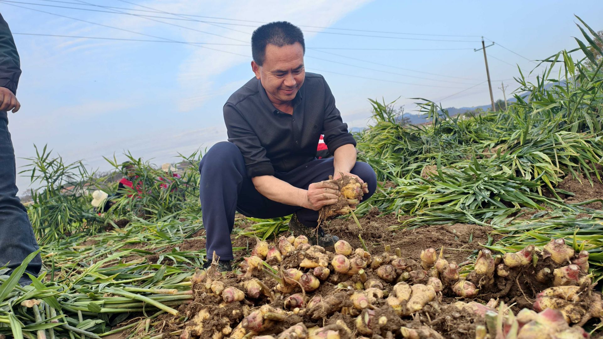 “這生姜個頭大、品相好,掰開辛香味撲鼻,今年準(zhǔn)能賣個好價錢!”正在采收的村民臉上滿是喜悅,將新鮮生姜在身后整齊碼放。