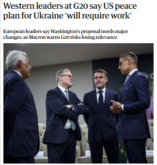 中新網(wǎng)11月23日電 據(jù)英國《衛(wèi)報》報道,當(dāng)?shù)貢r間22日,歐洲理事會、歐盟委員會、德國、法國、加拿大、愛爾蘭、意大利、西班牙、荷蘭、英國、挪威、芬蘭等多方發(fā)表聯(lián)合聲明,認為美方就結(jié)束烏克蘭危機提出的“28點”新計劃可以作為基礎(chǔ),但仍需要額外的工作。