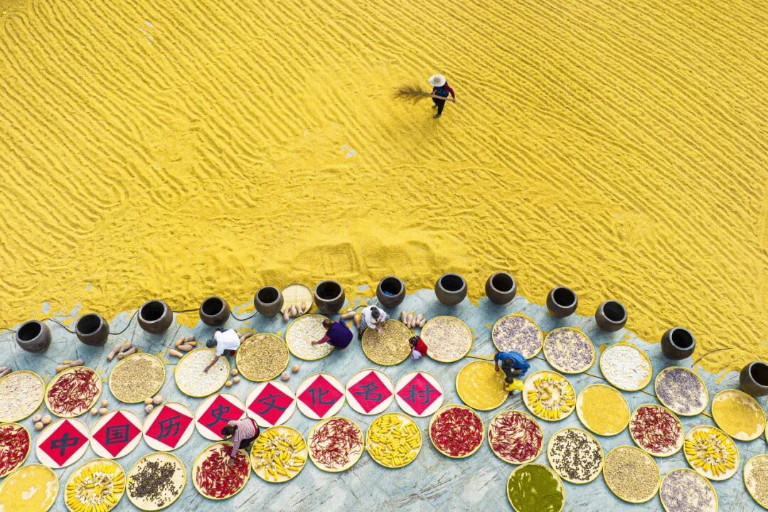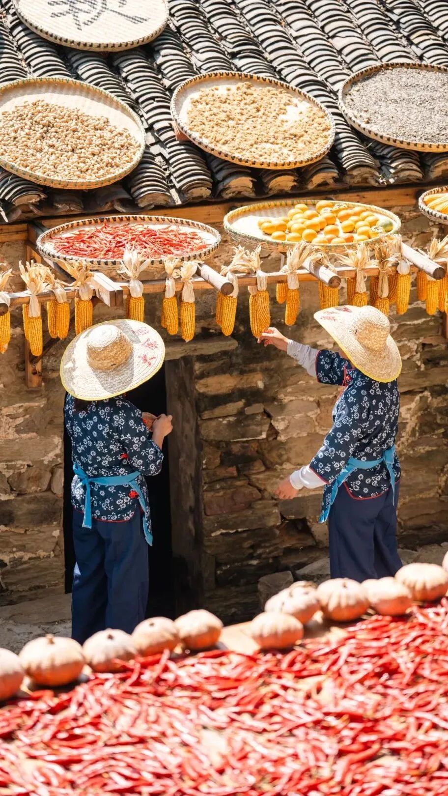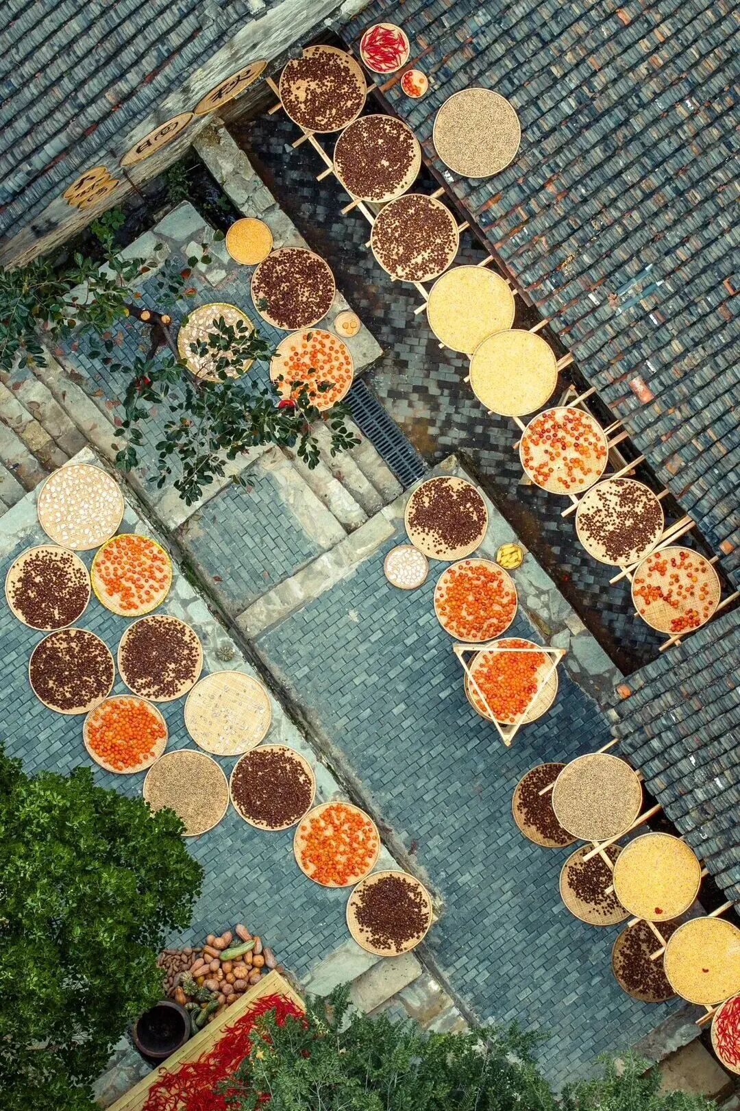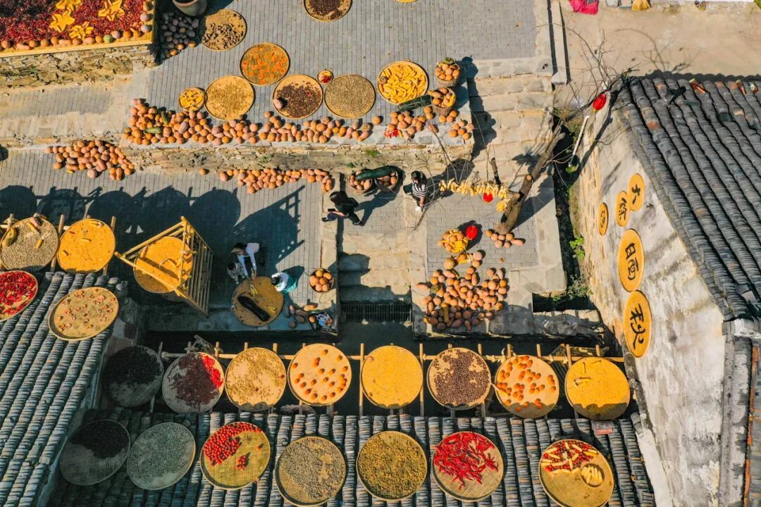 這不是擺設(shè)或表演,是真實(shí)的生活場(chǎng)景。家家戶戶門(mén)口擺放的竹匾里,晾曬的是他們一年勞作的收獲。
