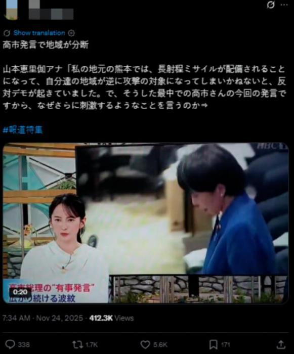 在社交媒體平臺(tái)上,一名網(wǎng)友援引日本主播的評(píng)論表示:“在我的家鄉(xiāng)熊本,由于(日本政府)決定部署長程導(dǎo)彈,當(dāng)?shù)匾殉霈F(xiàn)抗議集會(huì)。在此風(fēng)口浪尖,高市卻發(fā)表此番言論——(人們不禁質(zhì)疑)她為何要火上澆油?”