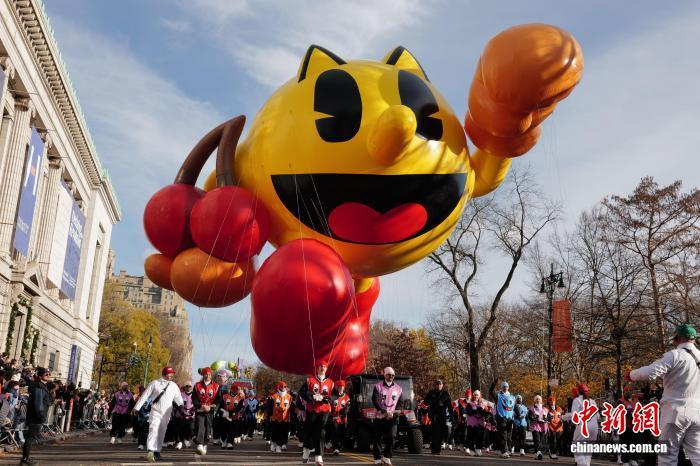 當(dāng)?shù)貢r(shí)間11月27日,第99屆梅西百貨感恩節(jié)大游行在美國(guó)紐約舉行。圖為“吃豆人”巨型氣球首次亮相紐約感恩節(jié)大游行?!≈行律缬浾?王帆 攝
