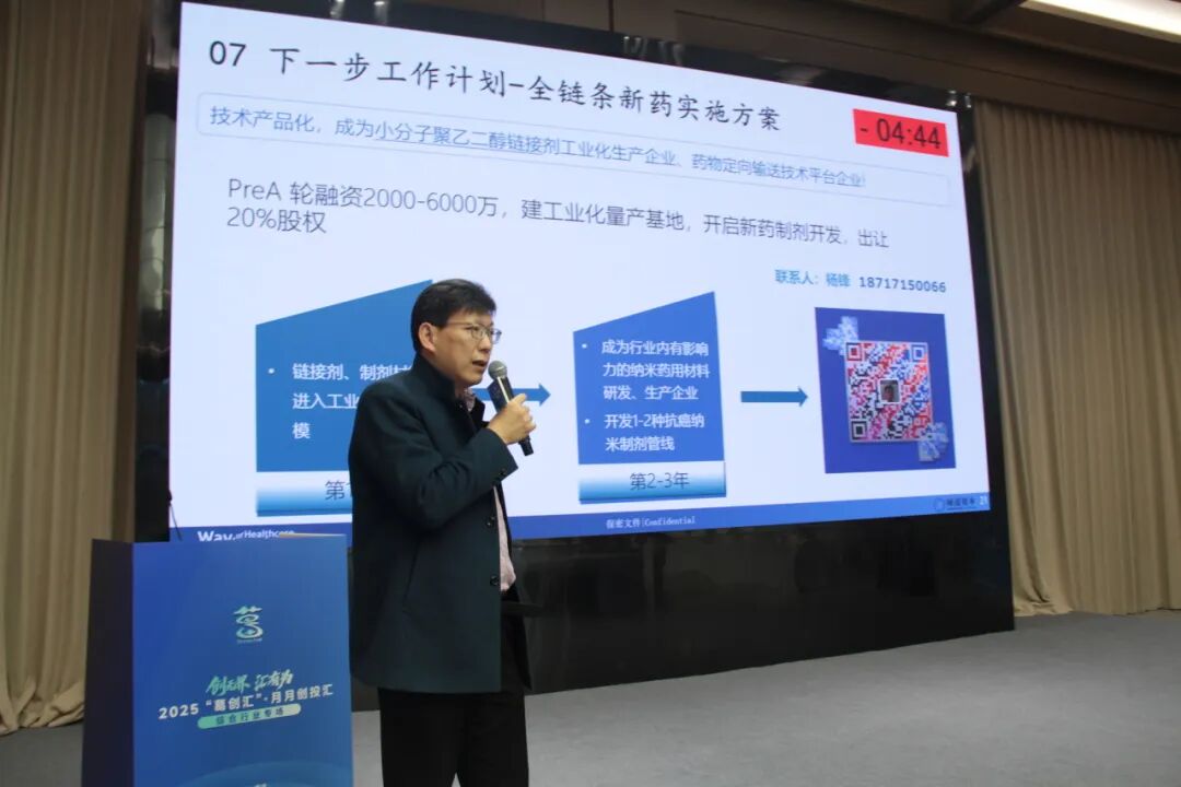 項目路演作為核心環(huán)節(jié),六大高精尖項目同臺競技,展現(xiàn)從“0到1”的突破性創(chuàng)新實力。抗癌納米脂質體制劑新材料項目由深耕生物醫(yī)藥領域多年的楊鋒博士領銜,其獨家單分散小分子量PEG工業(yè)化量產技術,一舉突破脂質體納米顆粒(LNP)生產瓶頸,填補國內外產業(yè)化空白。公司主營PEG鏈接劑、ADC Linker、mRNA疫苗輔料等核心產品,客戶涵蓋諾華、禮來等國際巨頭,已獲國家級科技型中小企業(yè)認定,未來聚焦個性化腫瘤治療全球化布局。