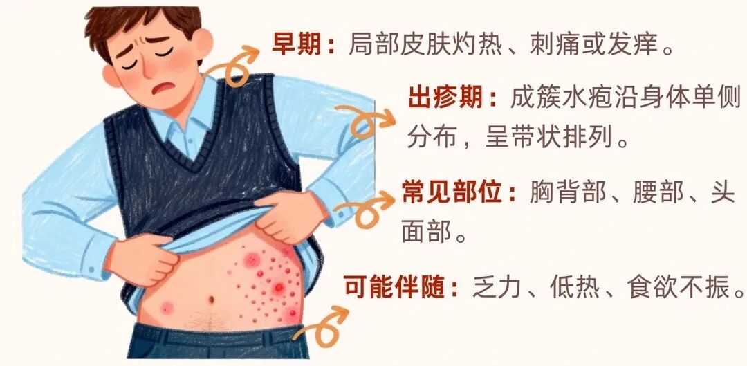典型癥狀:出疹前常有皮膚灼熱、刺痛或瘙癢等前驅(qū)癥狀,隨后出現(xiàn)帶狀排列的紅斑、水皰。其最顯著的特點(diǎn)是皮疹通常局限于身體一側(cè),不超過中線。