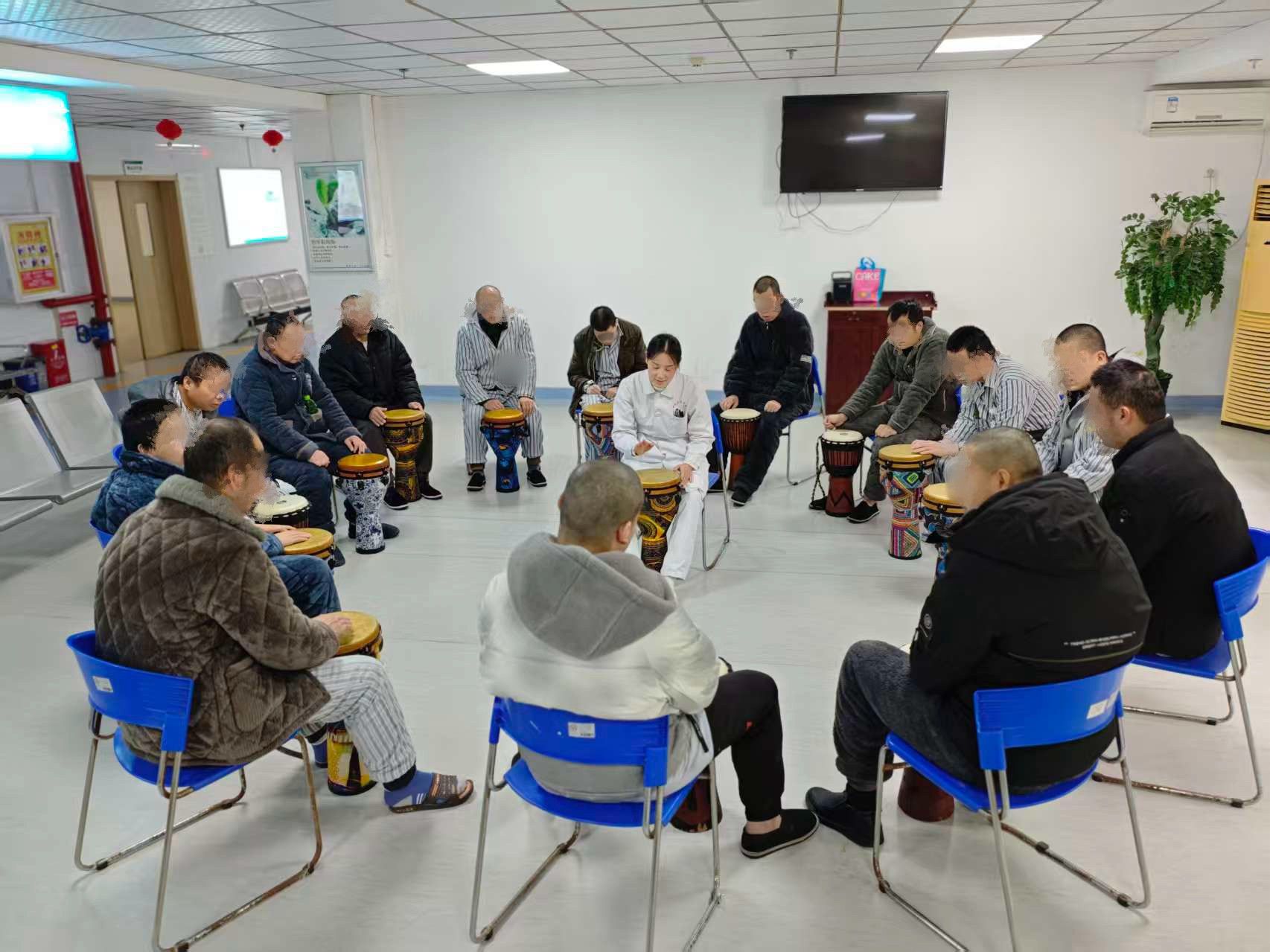“鼓圈就像一個(gè)包容又充滿力量的‘聯(lián)結(jié)圈’,我在鼓點(diǎn)的共振中釋放了積壓的壓力,情緒也得到了有效舒緩。跟著治療師的動(dòng)作節(jié)奏,心慢慢沉進(jìn)當(dāng)下的節(jié)拍里,真切體會(huì)到了‘同頻’的默契,特別踏實(shí)安心。” 一位患者在活動(dòng)后真誠(chéng)分享。這種沉浸式的參與體驗(yàn),能夠有效喚醒患者的內(nèi)在動(dòng)力,助力他們?cè)谧灾髡瓶氐墓?jié)奏中實(shí)現(xiàn)心理調(diào)適與社會(huì)功能修復(fù)?;颊邆?cè)谶@場(chǎng)節(jié)奏互動(dòng)中,不僅感知到聽覺、觸覺、視覺的多維聯(lián)動(dòng),更在“即興創(chuàng)作”與“節(jié)奏共鳴”中,尋得情緒疏解的有效出口,自信心與自我認(rèn)同感也得到了顯著提升。