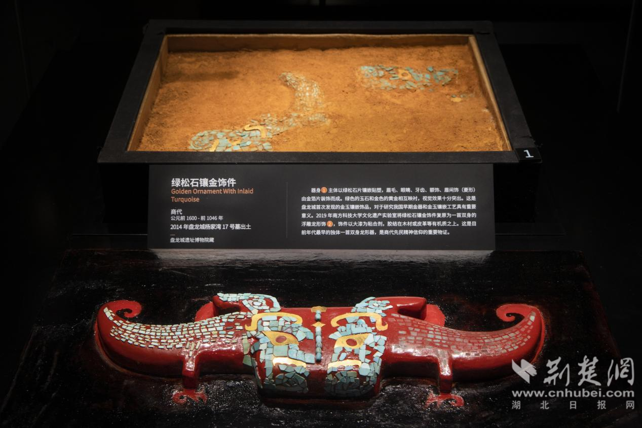 這么酷的設(shè)計(jì),靈感來源于盤龍城遺址博物院的鎮(zhèn)館之寶之一——綠松石鑲金飾件。原件出土于貴族墓葬,用上百片綠松石和黃金片手工鑲嵌而成,工藝精湛到令人驚嘆。它是商代長江流域文明的華麗見證,雖然具體用途成謎,但無疑是當(dāng)時(shí)權(quán)力與頂級(jí)審美的象征。