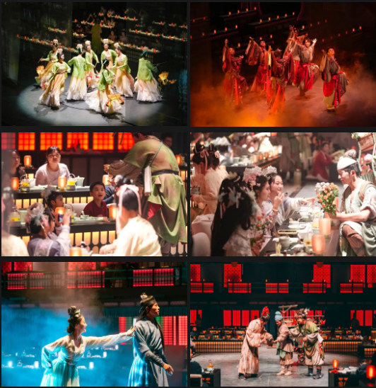 《清明上河·宋宴》沉浸式餐秀,以“活態(tài)宋式風雅”為主題的全景沉浸式宴演,通過“宴席+演藝+科技”的創(chuàng)新形式,讓游客化身北宋汴京雅士,跟著宋代名人的腳步風雅入宴。八幕十場,演繹大宋生活美學,從序章《菊盞流光》的茶香菊影,到終章《東京夢華》的市井煙火,讓游客充分感受“食不厭精 膾不厭細”的宋式飲食哲學。