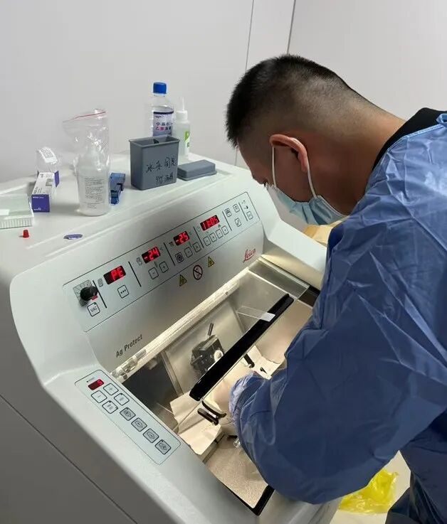 據(jù)悉,此次首例術(shù)中冰凍診斷的順利開展,源于病理科團隊的提前統(tǒng)籌與精細化籌備。在接到東城院區(qū)手術(shù)快速預(yù)約需求后,科室第一時間啟動協(xié)同機制:診斷醫(yī)師吳建山提前一天完成全流程預(yù)演,確保診斷環(huán)節(jié)無縫銜接;技術(shù)組李蓓、盧珂清晨到崗,對切片機、質(zhì)控試劑等關(guān)鍵設(shè)備進行全面預(yù)熱與調(diào)試,為標本處理的高效性和準確性筑牢基礎(chǔ)。