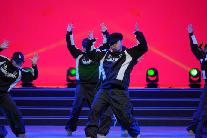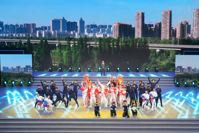19時55分,開幕式文體展演正式拉開帷幕,現(xiàn)場約3000名觀眾共同欣賞了這場兼具孝感地域特色與高水準藝術(shù)呈現(xiàn)的視聽盛宴。展演活動分為《感悟·澴川律動》《感動·家國深情》《感恩·建功支點》三個篇章,涵蓋街舞、武術(shù)、歌舞等多種形式,既展現(xiàn)本地文化底蘊,也傳遞出全民健身的活力與熱情。