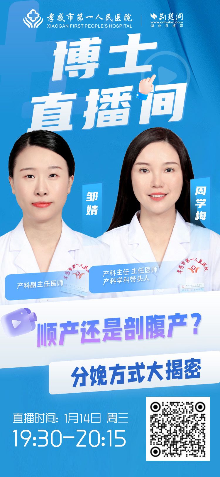 2026年1月14日(周三)19:30-20:15,孝感市第一人民醫(yī)院博士直播間,特邀產(chǎn)科主任周學(xué)梅、產(chǎn)科醫(yī)生鄒婧,結(jié)合數(shù)十年臨床經(jīng)驗(yàn),為你深度解析順產(chǎn)與剖腹產(chǎn)的核心問(wèn)題: