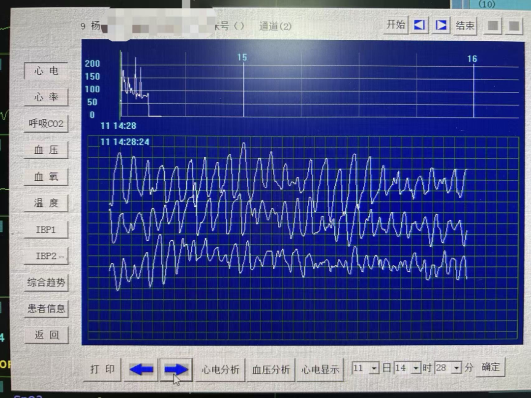 當日14時28分,心血管內(nèi)科責任護士李文秀如往常一樣,專注地監(jiān)測著遙測心電監(jiān)護儀。突然,一陣急促而不規(guī)則的警報聲響起——那是9床楊婆婆的遙測心電監(jiān)護儀發(fā)出的警報。李文秀瞬間將目光鎖定屏幕,只見原本規(guī)律的心電波形已變?yōu)殡s亂無章的“蚯蚓狀”,這是最危險的心律失常之一:心室顫動(室顫),意味著心臟已失去有效泵血功能,患者生命正以秒為單位流逝。