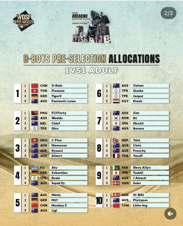1月17日至18日,由世界體育舞蹈聯(lián)合會(WDSF)主辦、澳大利亞體育舞蹈聯(lián)合會承辦的2026 WDSF World Breaking Dancesport Festival在澳大利亞布里斯班圓滿收官。本次霹靂舞比賽既是世界巡回積分賽,也是青奧會積分賽,不僅為全球頂尖霹靂舞運動員提供了高水準的競技舞臺,更旨在推動霹靂舞項目進入2032年布里斯班奧運會。中國霹靂舞隊表現(xiàn)搶眼,捷報頻傳。其中,我省運動員王瑞苗在個人賽男子組中過關闖將,并在決賽中以2:1戰(zhàn)勝日本名將Hiro 10成功奪冠,這不僅是他個人職業(yè)生涯的里程碑,也是省社體中心在WDSF賽事上獲得的首個世界冠軍。