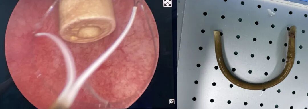 然而,在膀胱鏡檢查術(shù)中,醫(yī)生發(fā)現(xiàn)這根異物竟是半截被結(jié)石包裹的舊導(dǎo)尿管??紤]到激光破碎可能損傷膀胱黏膜,晏增亞當(dāng)機(jī)立斷,決定調(diào)整手術(shù)方案。他與張佳晨醫(yī)生默契配合,利用簡易套索工具,精準(zhǔn)套住異物一端,小心翼翼地調(diào)整角度,穩(wěn)步將這根潛藏多年的“陳年老物”完整取出。整個手術(shù)過程不到十分鐘,出血少、創(chuàng)傷小,既避免了器械破碎帶來的潛在損傷,又為患者大幅節(jié)約了治療費用。