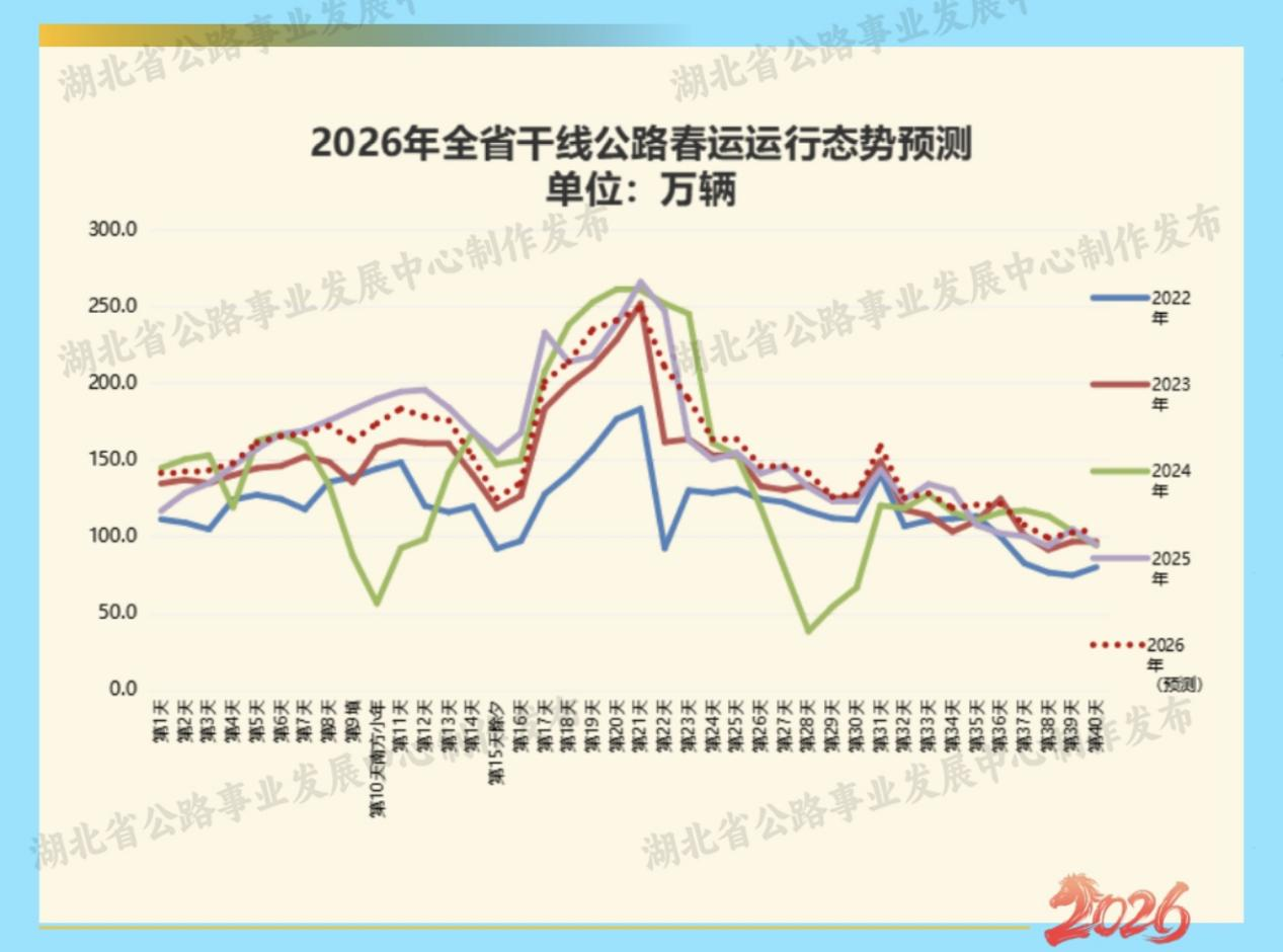 根據(jù)歷年來(lái)春運(yùn)車流規(guī)律分析,預(yù)判2026年春運(yùn)期間高速公路日均通行車輛出口流量,較2025年春運(yùn)同期增長(zhǎng)約4.7%;較2024年春運(yùn)同期增長(zhǎng)約16.9%,約為平日流量的1.5倍。其中,預(yù)判春運(yùn)期間全省高速公路跨省通行車輛日均出口流量,占春運(yùn)日均流量約17%;較2025年春運(yùn)同期增長(zhǎng)約7.6%,較2024年春運(yùn)同期增長(zhǎng)約22%。