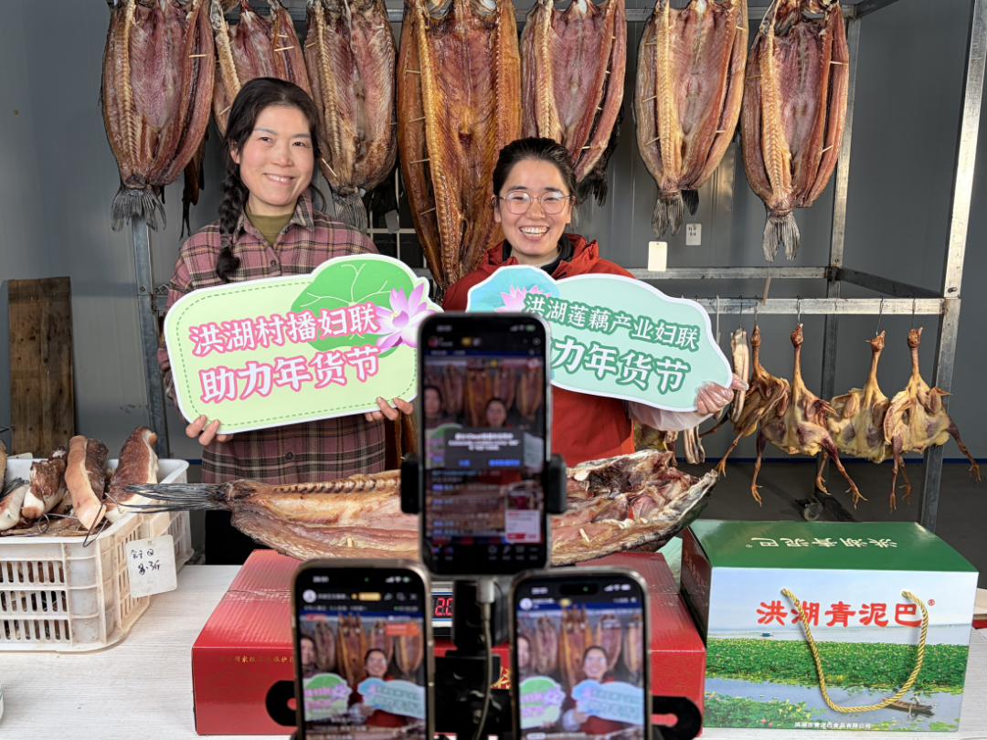 洪湖市蓮藕產(chǎn)業(yè)鏈婦聯(lián)、村播婦聯(lián)通過直播推介蓮藕、臘肉等年貨,以“線上+線下”融合模式讓家鄉(xiāng)美味走向全國。