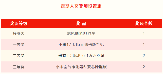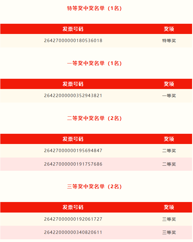 第一期定期開獎(jiǎng)范圍為1月24日至2月2日期間開具并驗(yàn)證合格參與即開即獎(jiǎng)的數(shù)電發(fā)票。定期開獎(jiǎng)采取實(shí)物獎(jiǎng)品方式,共設(shè)有4個(gè)獎(jiǎng)項(xiàng)等級(jí)。