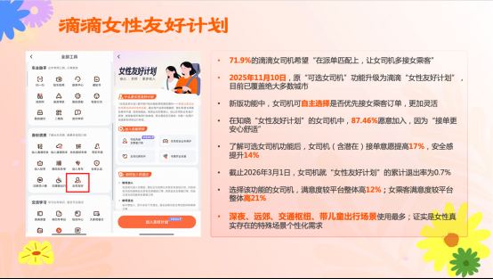 “女性友好計劃”是滴滴在2025年11月對“可選女司機(jī)”功能的升級:女乘客可以個性化設(shè)置偏好,選擇優(yōu)先呼叫女司機(jī)。女司機(jī)也可以自主選擇加入或退出優(yōu)先接女乘客,接單更靈活。據(jù)調(diào)研數(shù)據(jù),該功能使女司機(jī)安全感提升14%,滿意度較平臺整體高12%。乘客在深夜、遠(yuǎn)郊、交通樞紐、帶兒童出行場景使用該功能最多,證實是女性真實存在的特殊場景個性化需求。