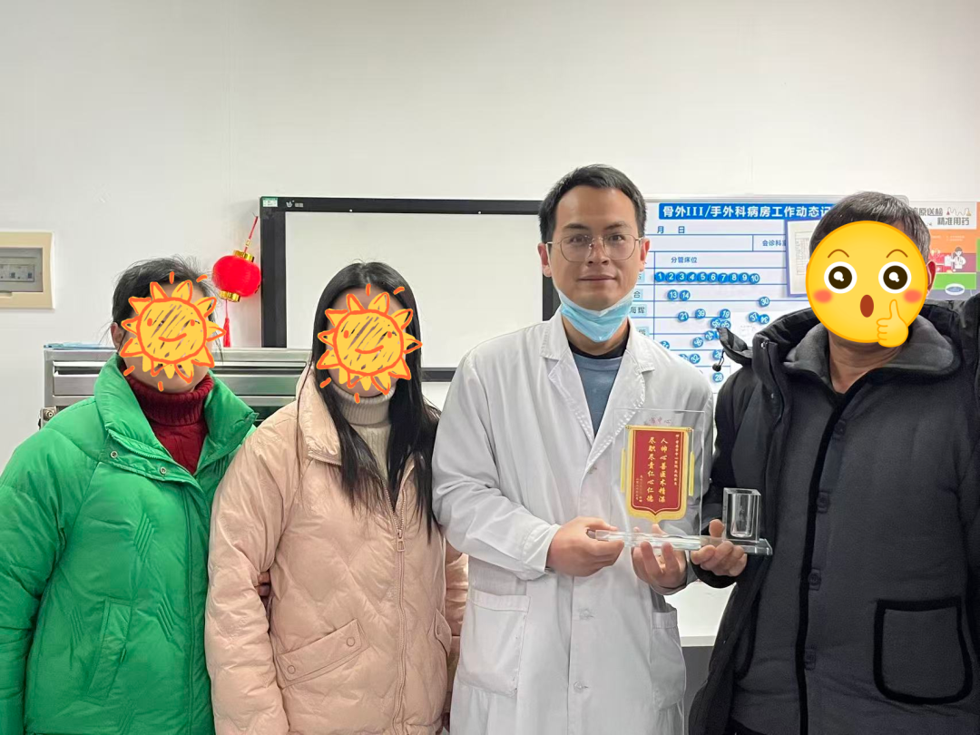 為最大限度保留患者手指功能,醫(yī)療團(tuán)隊(duì)立即制定個(gè)性化手術(shù)方案。手術(shù)從當(dāng)日白天持續(xù)至夜間,吳航在顯微鏡下精準(zhǔn)開(kāi)展清創(chuàng)、骨支架重建、肌腱縫合、血管神經(jīng)吻合及皮膚修復(fù)等一系列操作。術(shù)后經(jīng)過(guò)精心的護(hù)理,龍先生再植的三根手指全部存活,傷口及植皮區(qū)域愈合良好。為了表示感謝,龍先生專(zhuān)程從云夢(mèng)趕到醫(yī)院,向吳航送上一面水晶錦旗,動(dòng)情地表示:“多虧了吳醫(yī)生,才讓我的三個(gè)手指全部保住了!”